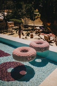 Renowned curator Serge Haeltermann selected the art and literature that fill the space, also collaborating with Belgian artist Eva Lynen to craft custom Roca House artwork. Senior designer Evita Appendin worked in close partnership with local architect Maria Carreño to design an eclectic environment that evokes the exuberance of the '60s, '70s, and '80s.